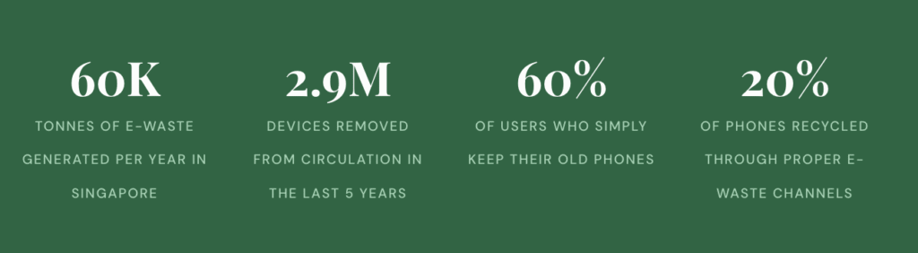 Singapore leads the region in smartphone adoption at 97% ownership — and we replace our phones every 2.7 years, significantly faster than the global average of 3.5 years. Each new device produced requires roughly 268kg of raw materials. Most of that is unrecoverable without proper recycling. The gap between what’s generated and what’s tracked is enormous.